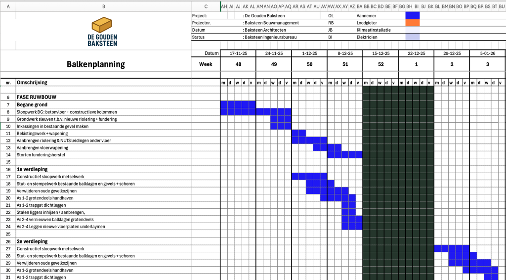 In de bouw wordt een balkenplanning vaak gebruikt om verschillende fases en disciplines binnen een project te plannen — van de fundering tot en met de afbouw. Het is een krachtige tool voor uitvoerders, werkvoorbereiders en projectleiders om de voortgang van het project te coördineren.